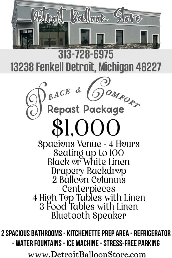 Our Comfort & Care Repast Package includes linen, centerpieces, drapery backdrop, table settings with waters, plates, napkins, balloons. PLEASE CALL 313-728-6975 TO CHECK DATE AVAILABILITY before you pay !